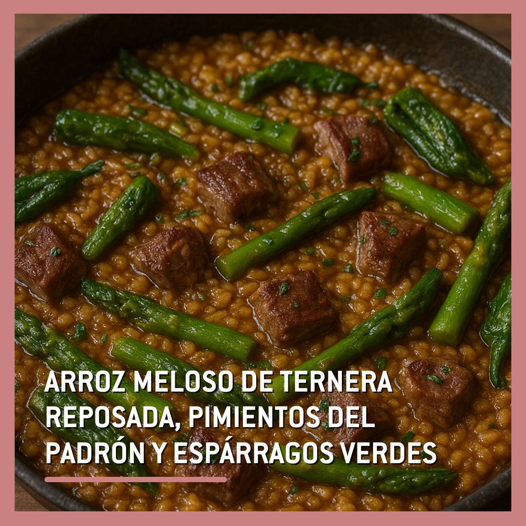 - Creamy rice with rested beef, Padrón peppers and green asparagus